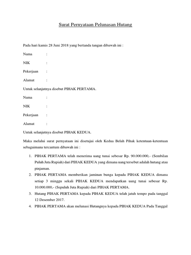 Contoh surat perjanjian hutang tentu saja dibutuhkan pihak pemberi pinjaman. Selain itu, ada juga pengertian lain. Surat pernyataan pelunasan hutang dan jaminan. Contoh surat pernyataan pelunasan hutang bermaterai download: Berikut ini contoh surat pernyataan penyerahan tanah atas pelunasan hutang dikarenakan terhutang tidak dapat melunasi hutangnya berupa uang dan menyerakan harta kepemilikan tanah sebagai ganti pelunasan hutang.
